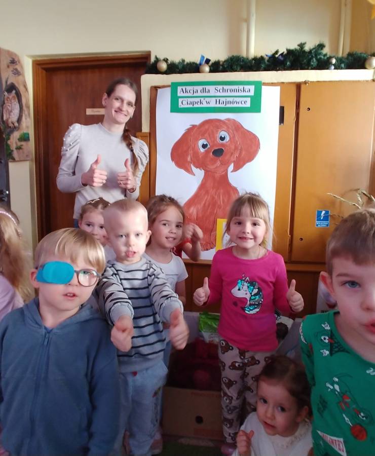 W związku z realizacją projektu w grupie Wiewiórki zorganizowaliśmy wraz z dziećmi pomoc dla Schroniska Ciapek w Hajnówce. Zorganizowaliśmy w korytarzu zbiórkę i zebraliśmy najbardziej potrzebne rzeczy takie jak: warzywa, karmę suchą i mokrą. W akcji zbiórki jedzenia wzięły udział wszystkie grupy wraz z rodzicami. Dziękujemy dzieciom i rodzicom za zaangażowanie w imieniu piesków ze Schroniska.