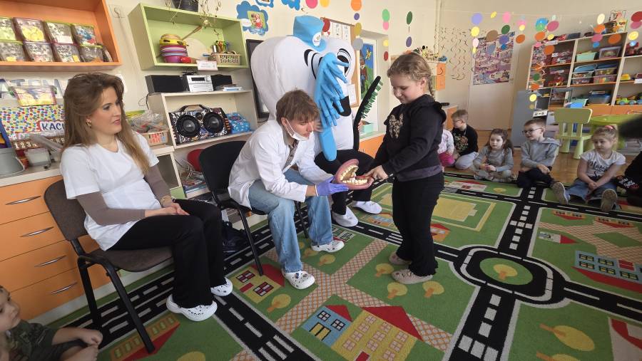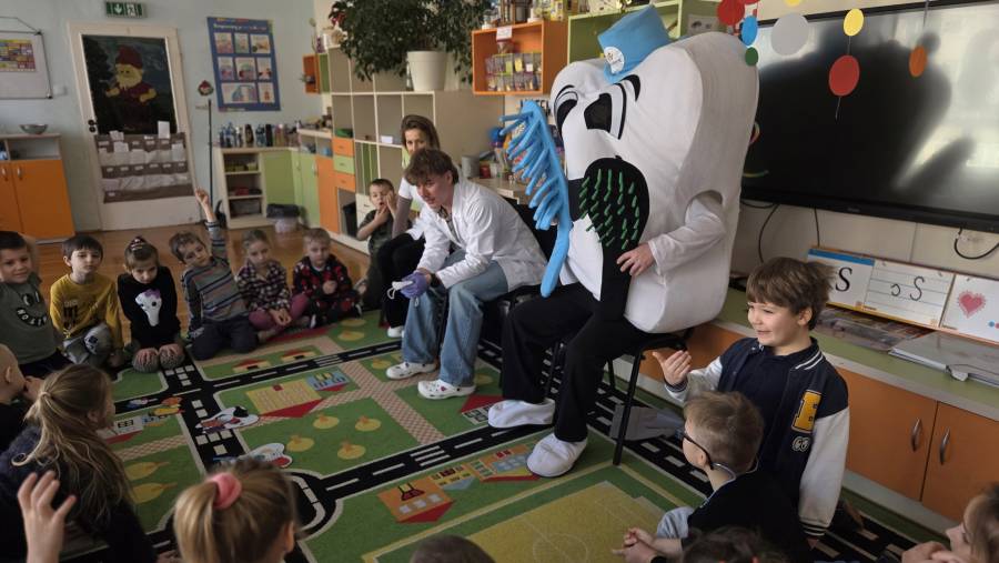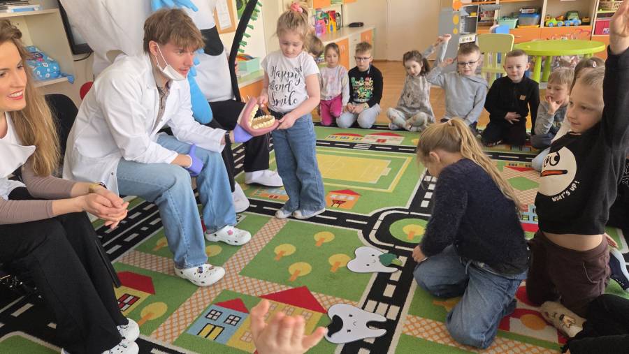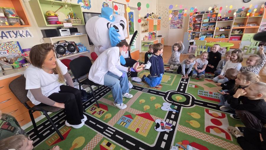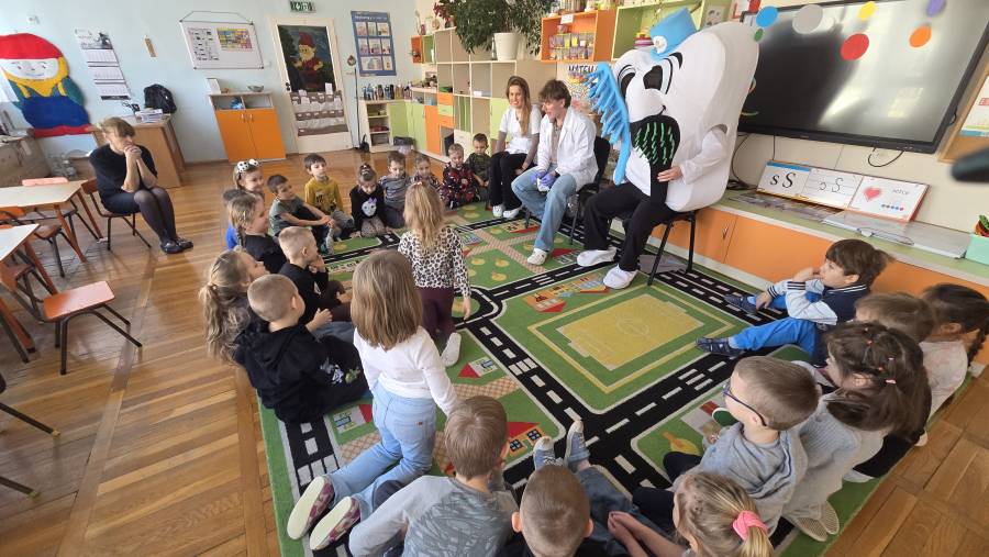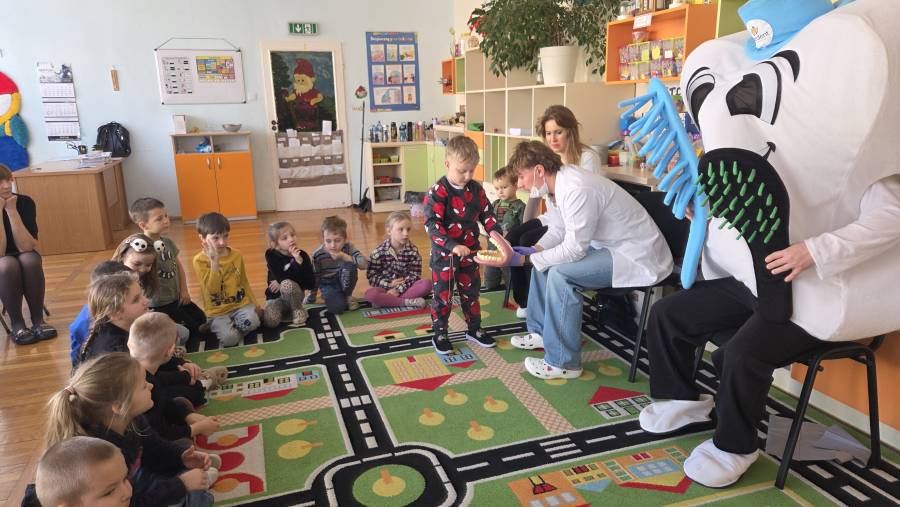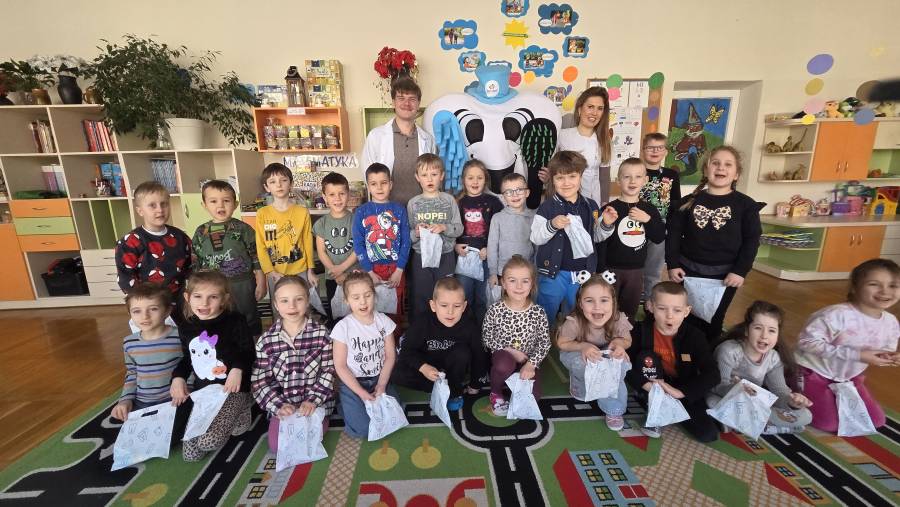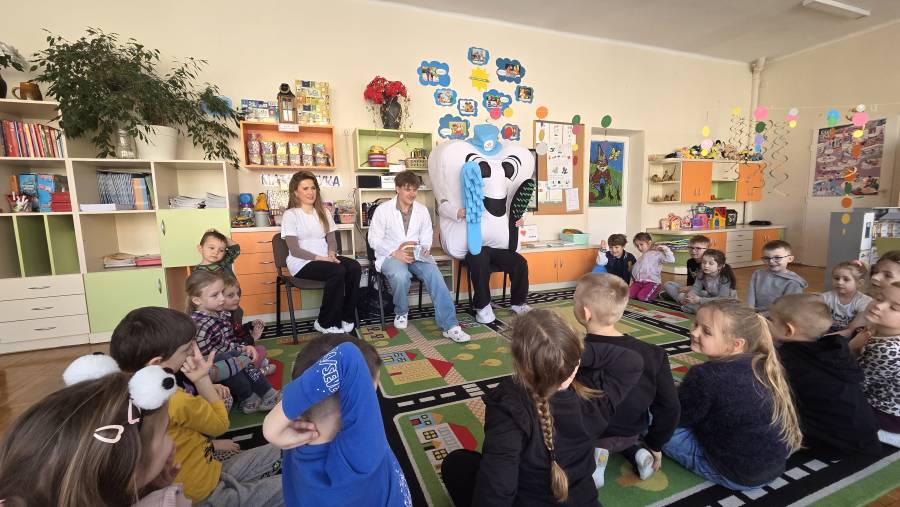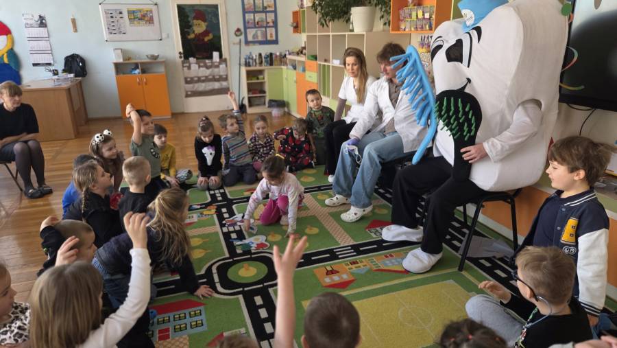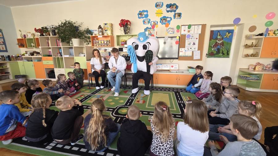 16.02.2026r dzięki uprzejmość mamy Alka W. w Krasnalach odbyło się spotkanie profilaktyczne z Panem Ząbkiem i panią stomatolog na temat higieny jamy ustnej i zapobiegania próchnicy.